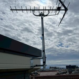 八木式(UHF)アンテナは素子が露出したシンプルな構造です。 素子数の種類が豊富で広範囲の電波地域で利用されています。 八木式アンテナは設置の自由度が高く、他の種類の地デジと比べて安価のため、墨田区でも広く活躍しています。 設置場所としては屋根上や壁面、場合によっては屋根裏も選択できます。