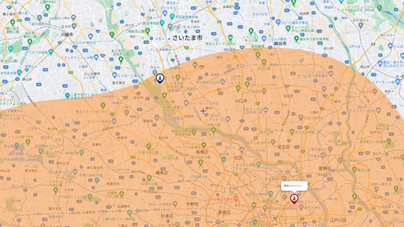 また、上記別の画像は東京スカイツリーから発信される東京MXの電波受信エリアを表しています。