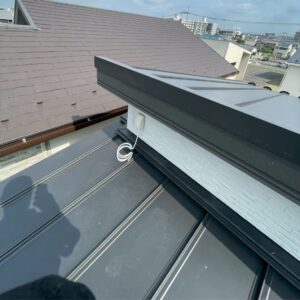 一般的には外壁に専用金具を使って密着する形で設置しますが、S様邸では「サイドベース」と呼ばれる金具を使い、破風板に設置しました。