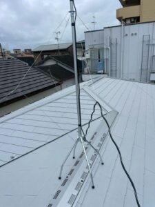 屋根上に設置する際には、アンテナの足場四か所をワイヤーでしっかり固定して安全性を確保します。